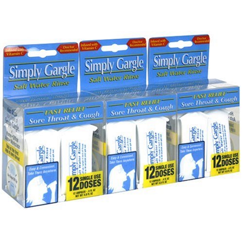Fast relief. Infused with Vitamin C, grape seed extract, rosemary extract, rose hips extract, witch hazel extract, sage extract. Doctor recommended. Easy & convenient. Take them anywhere. 12 Single use doses. Simply Gargle's Proprietary formula technology is a convenient pre-mixed liquid of salt water and herbs you can carry and use anywhere, anytime. Salt water gargle is recommended by family physicians, the National Institute of Health and the Harvard Medical School as an effective remedy for irritated throats. Keep single use doses of Simply Gargle at: home, office, auto, workplace. Take at the first sign of sore throat. Easy snap-off tip. Made in USA. See all Simply Gargle Salt Water Rinse, 0.4-Ounce Ampules in 12-Count Boxes pack of 3OverviewReview Rating :